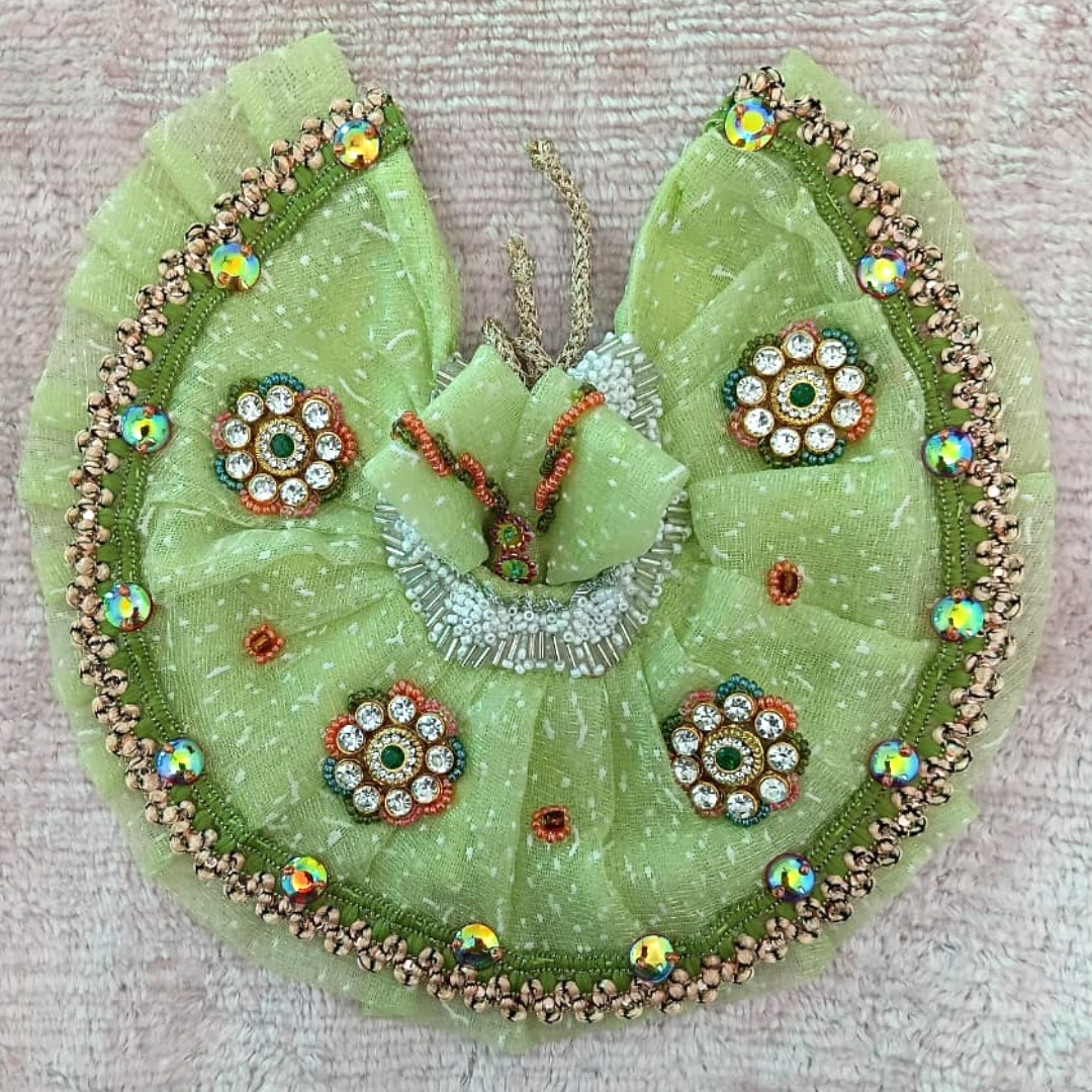 Elevate your worship with this vibrant and exquisitely designed poshak for Bal Krishna. The rich light green fabric is framed by a gorgeous border of green beads and playful golden orbs, while the center features intricate floral motifs with stunning green gems. Multi-colored iridescent gems add a touch of celestial sparkle to this unique dress. Perfect for daily pooja rituals and festive occasions, this Krishna dress adds purity, devotion, and beauty to your sacred space.