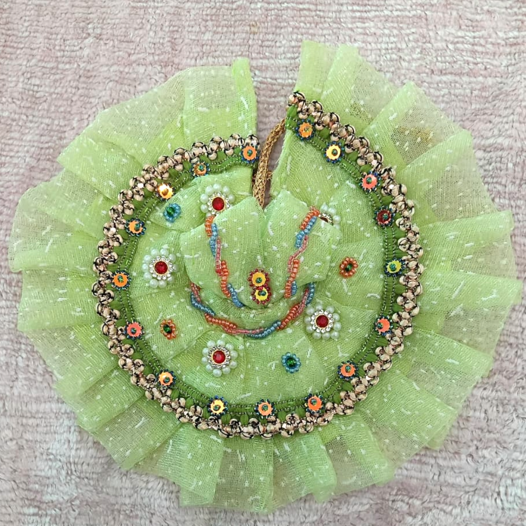 This delightful light green poshak for Bal Krishna captures the joyful spirit of devotion. The dress is trimmed with a vibrant border of colorful sequin flowers and tiny golden ghungroo bells, creating a charming and festive look. The scattered gem and bead detailing throughout the fabric add a touch of sparkle, symbolizing the joy of worship. Perfect for daily pooja rituals and festive occasions, this Krishna dress adds purity, devotion, and beauty to your sacred space.